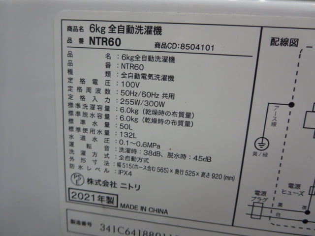 商品名 きれい!ニトリ洗濯機6キロ2021年製